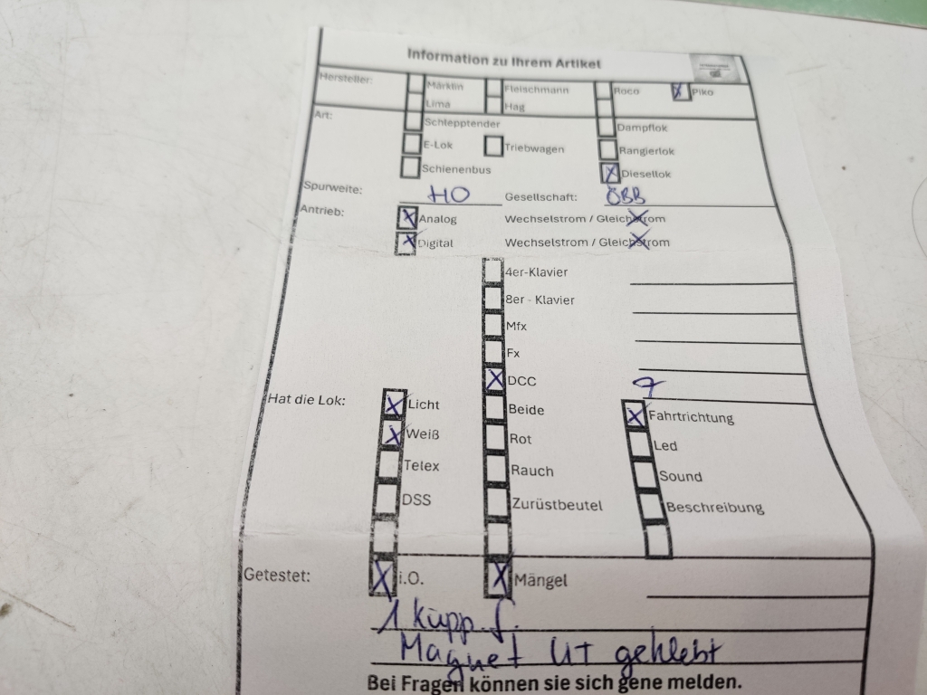 Zustand 2-3 Analog Lok ist getestet i.o Licht ist getestet i.o. Magnet UT Nur 1 Kupplung Adresse 7 DCC