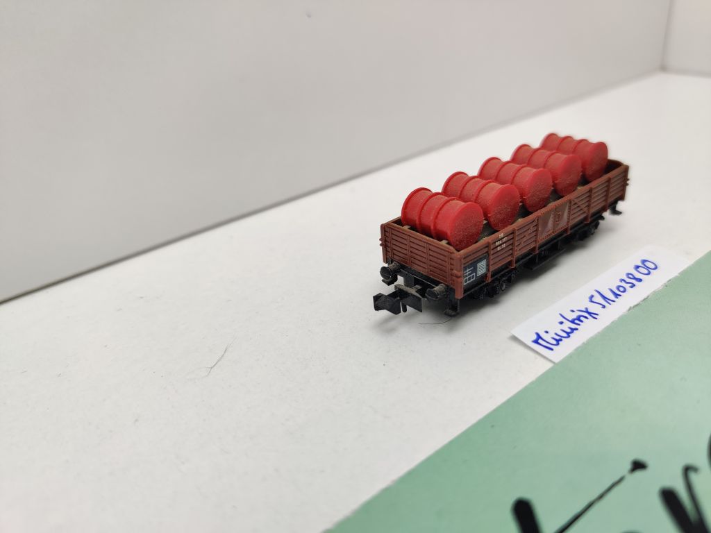 Minitrix N DC 51 1038 00 Mittelbordwagen / rote Fässer / Omm32 / DB